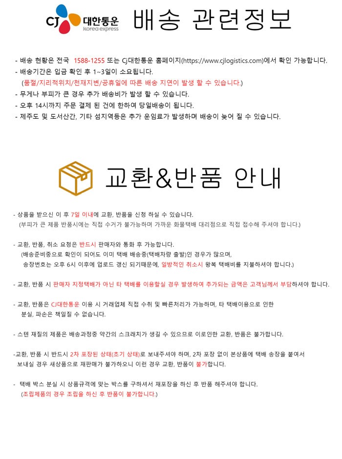 | 반품비용 | 반품배송비 : 2,500원 (구매자 단순 변심으로 인한 반품에만 반품비용 부과) 초기배송비가 무료인 경우 반품배송비가 왕복으로 청구될 수 있습니다. 교환 비용은 경우마다 상이하나, 보통 반품배송비의 2배가 부과됩니다. |